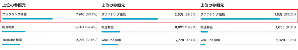 通常、YouTubeでは「ブラウジング機能(おすすめ表示)」が視聴数の大部分を占めます。下記は当社で運用しているYouTubeチャンネルにおいて、1万回以上の再生を獲得している動画のアナリティクスデータです。分析結果を見ると、視聴経路の上位はやはり「ブラウジング機能」が中心で、全体の約50〜80%を占めていました。