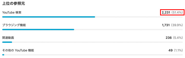多くの動画は「視聴者が探して見つけた動画」ではなく、YouTube側のレコメンド(おすすめ表示)によって再生されているということがわかります。それに対して「YouTube検索」からの流入が増えるというのは、ユーザーが能動的に動画を探して視聴している状態を意味します。